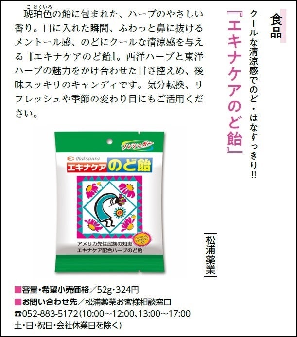 漢方薬および健康食品の企画・製造ならびに販売を手掛ける松浦薬業株式会社(本社営業所:愛知県名古屋市昭和区、代表取締役社長:渡辺知幸)の『エキナケアのど飴』は、「月刊ことぶき」(制作 寿出版株式会社、販売 株式会社ドラッグマガジン)10月号特別大企画「読者のみなさま発『お役立ちのこの一品』」において、読者のみなさまより多大なるご支持をいただき、選出されました。