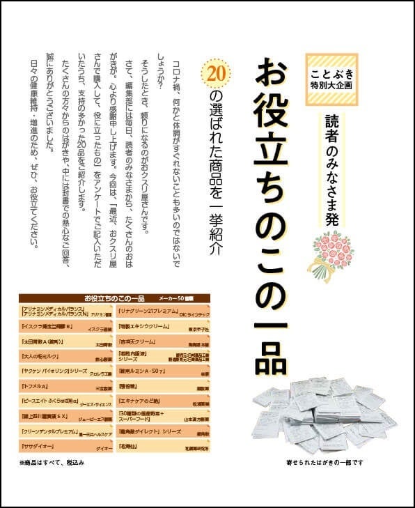 読者のみなさまから編集部に毎月寄せられるハガキにて「最近、おクスリ屋さんで購入して、役立ったもの」をご記入いただくアンケートが実施され、特に支持の多かった20品が10月号誌面にて紹介されました。
