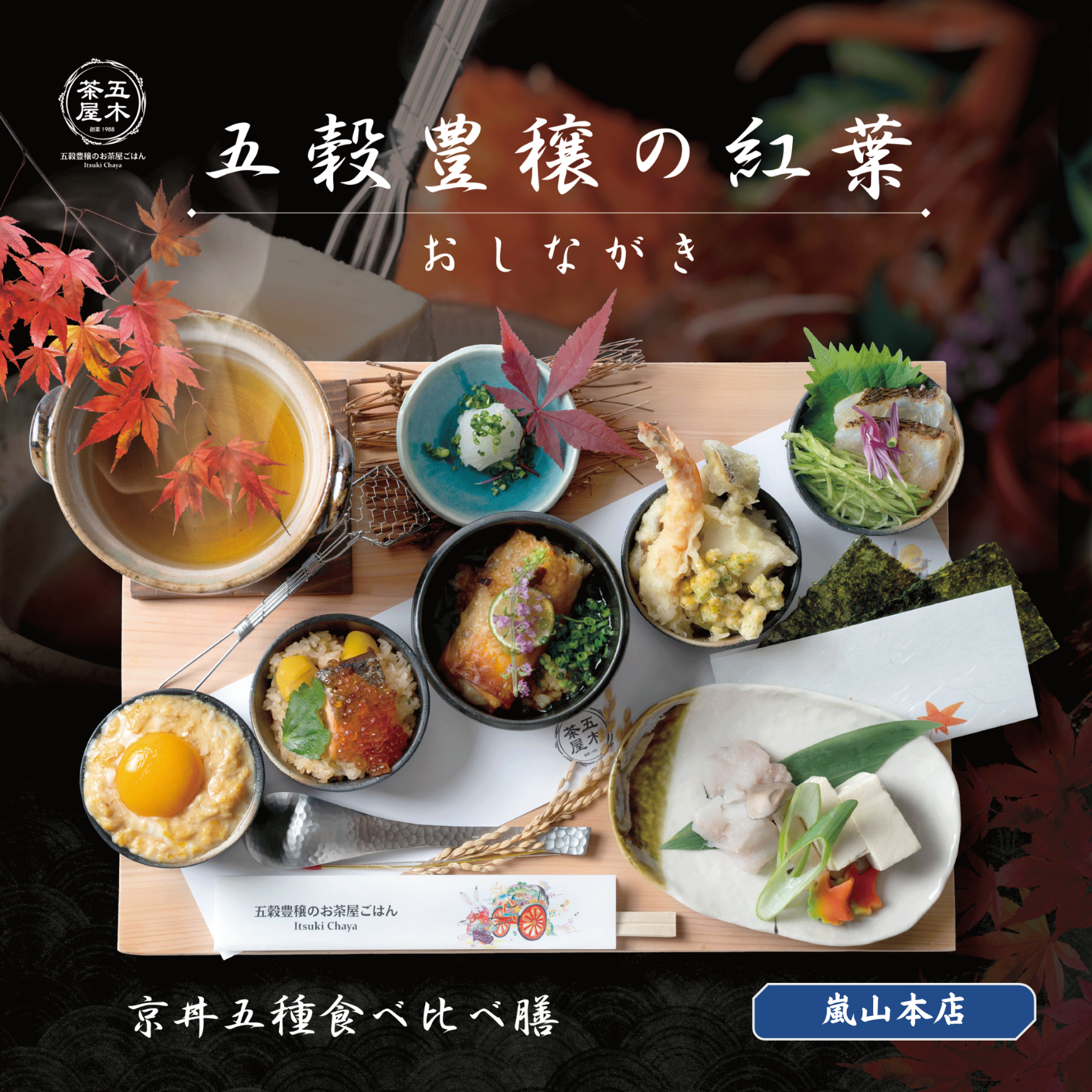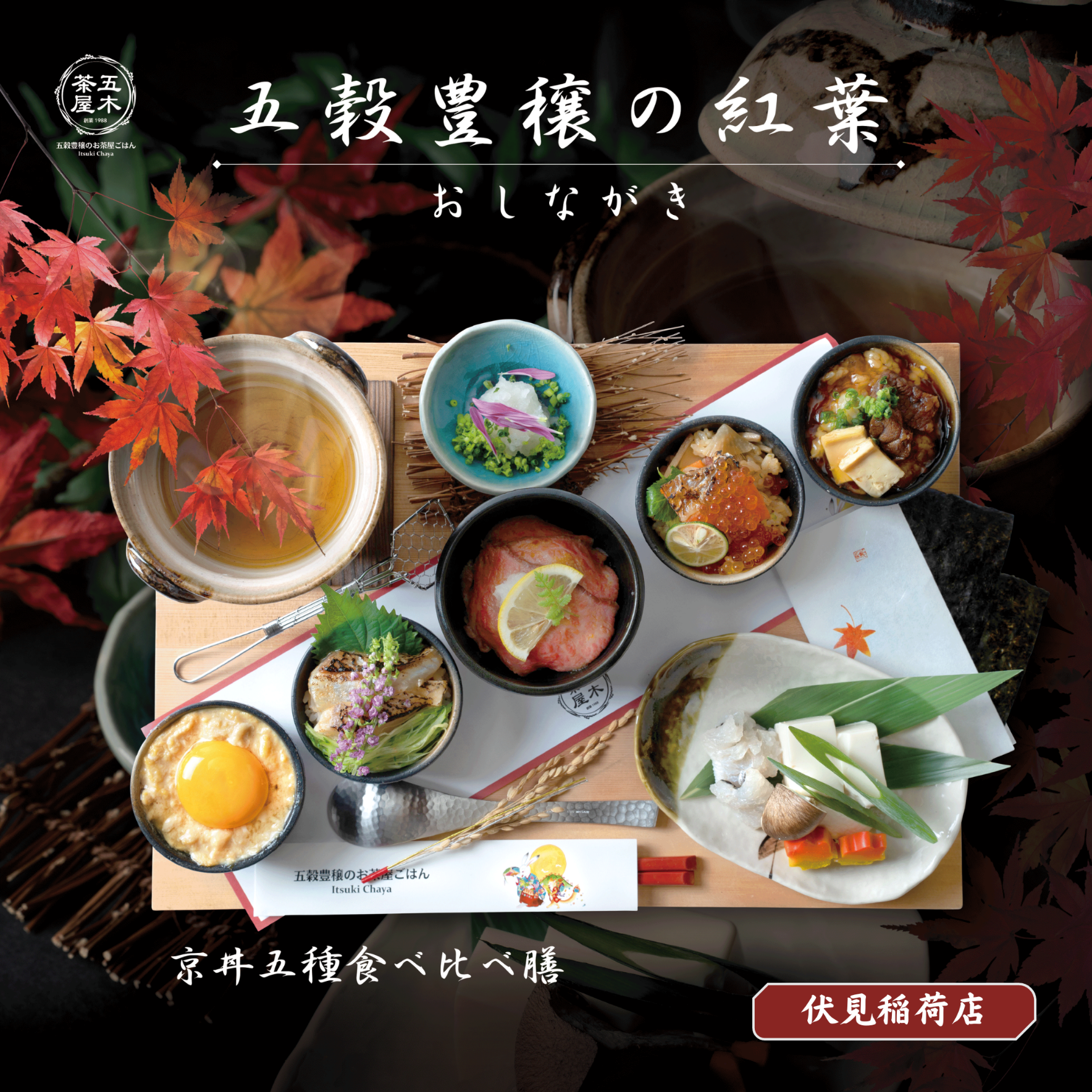 KYOTO.LANDMARK株式会社は、五穀豊穣のお茶屋ごはん 五木茶屋®︎の新メニューを嵐山本店・伏見稲荷店両店舗で発表しました。10月1日から、秋の味覚を楽しめる京丼五種食べ比べ膳を発売します。また、公式Instagramにて秋の無料ご招待の催しも開催します。