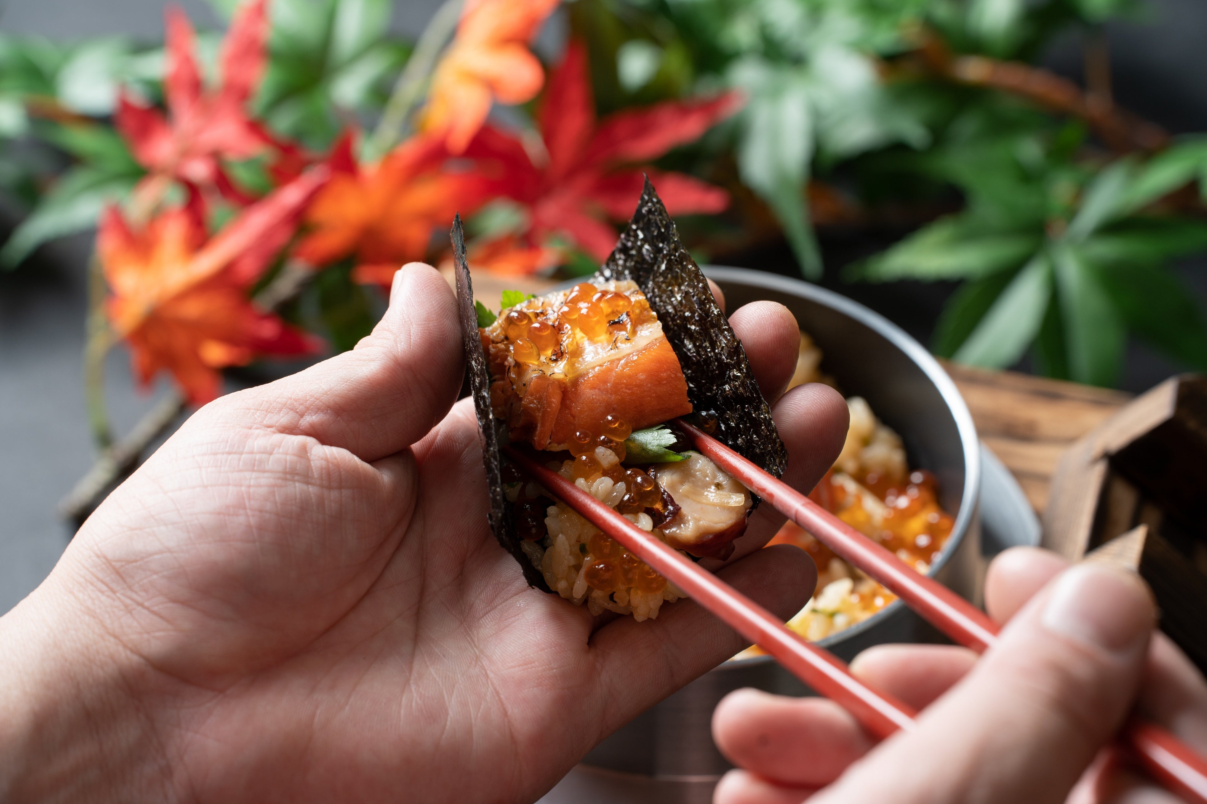 栗やきのこ、京野菜を使った炊き込みご飯に秋鮭といくらを添えております。
