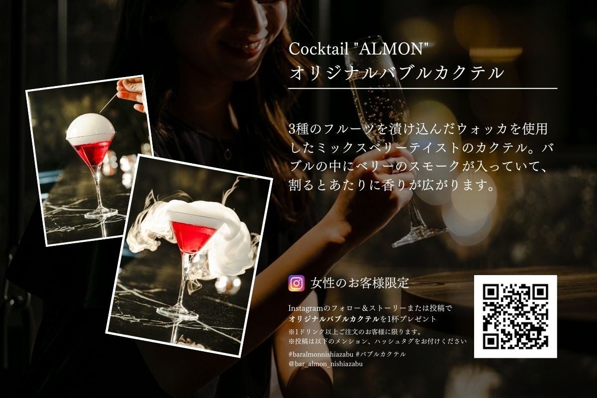 当店のInstagramをフォロー&ストーリーまたは投稿をしていただいた女性のお客様に限定で、ALMONオリジナルバブルカクテルを1杯プレゼントしております。