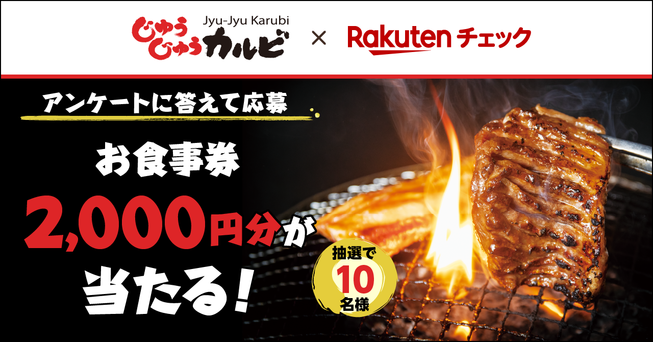 ・キャンペーン内容:キャンペーン期間中に、「楽天チェック」アプリ内のキャンペーンアンケートに回答した方の中から抽選で10名様に「じゅうじゅうカルビ」のお食事券2,000円分を進呈します。