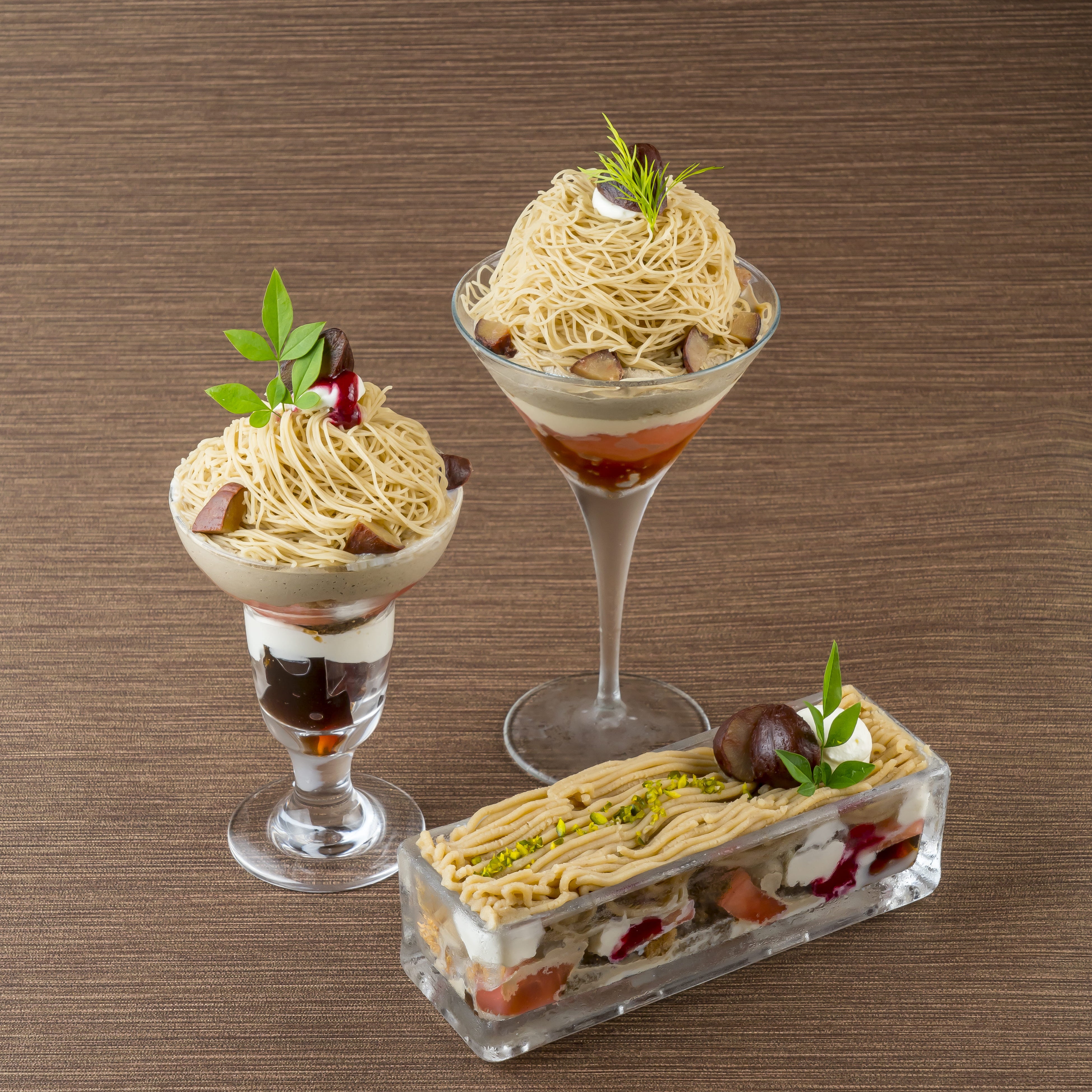 滑らかなモンブランの土台部分には、素焼きもなかを使用した「もなかわショコラ」をベースに栗のババロア、ブランデーを効かせたほうじ茶生地、ほうじ茶クリームをそれぞれ重ねて大人向けの落ち着いた組み合わせに。
