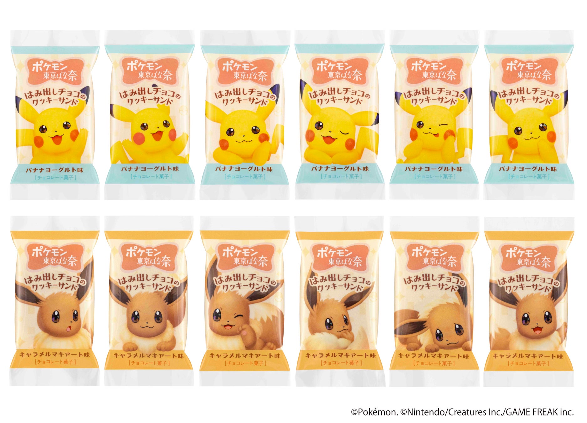 「はみ出しチョコのクッキーサンド」は、バナナヨーグルト味とキャラメルマキアート味の2つのおいしさをIN。バナナヨーグルトチョコレートをサンドした方にはピカチュウの絵柄を、キャラメルマキアートチョコレートをサンドした方にはイーブイの絵柄をそれぞれ描いています。シャリシャリッと軽やかに香ばしく焼きあげたラングドシャクッキーに描かれたピカチュウ&イーブイはそれぞれ6種類。どの絵柄が出るかはあけてみてのお楽しみ!