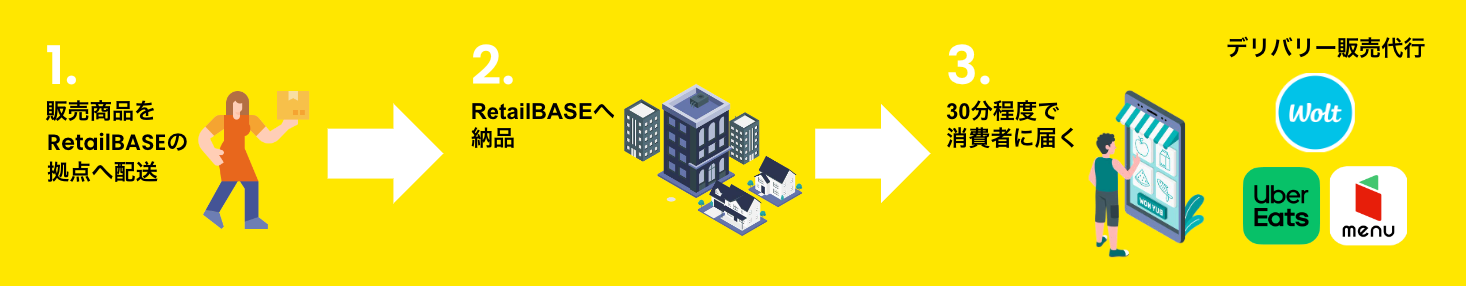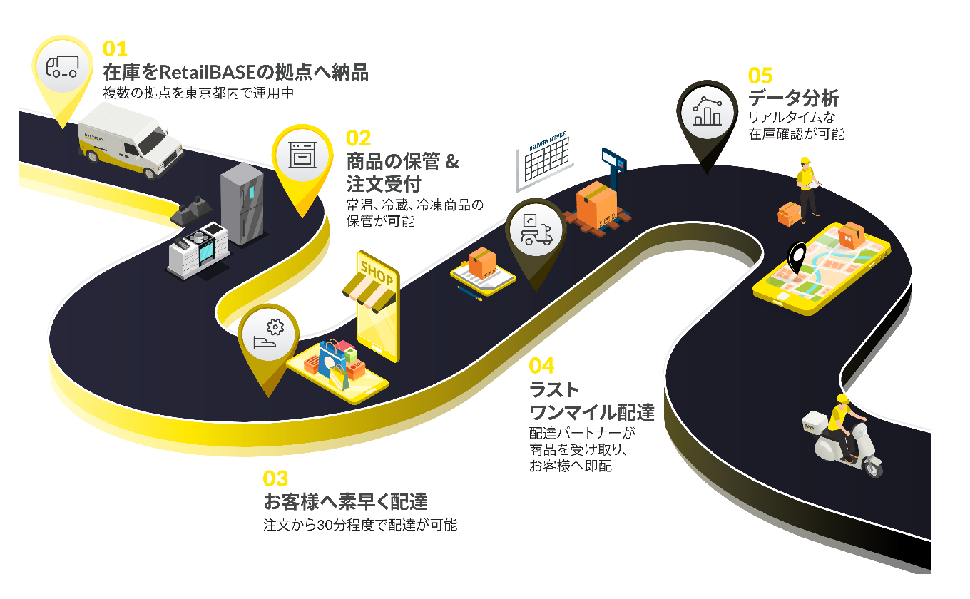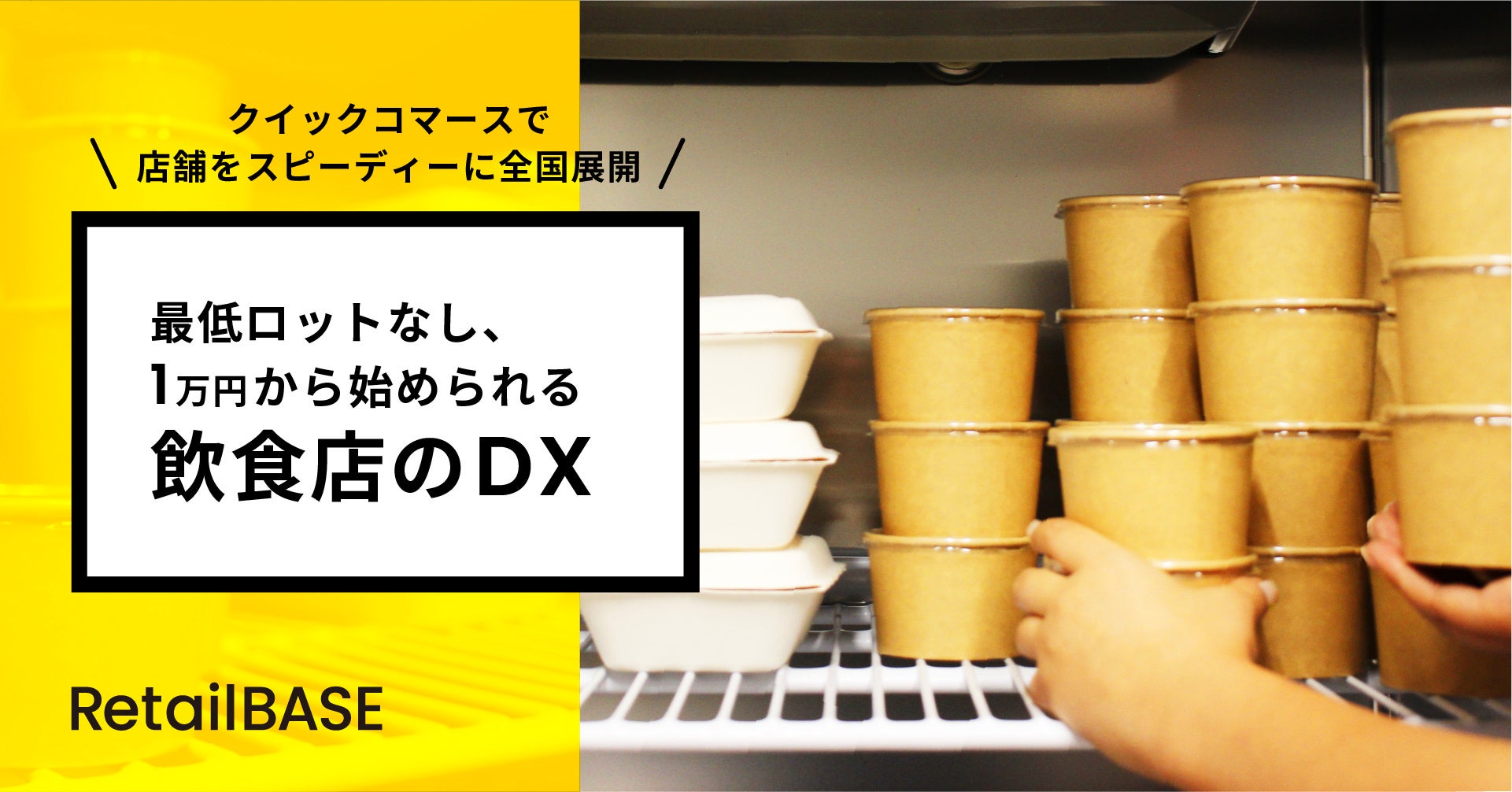 KitchenBASEでは客席のないクラウドキッチンを運営し、初期費用を1/10ほどに抑え、1人でも開業できる効率的なキッチンやシステムを開発してきました。今では東京に8施設、大阪に1施設を設け、多拠点での同時開業も可能です。その施設をクイックコマースの拠点として活用し*、最低1万円から始められる、食品eコマース向けサービス「RetailBASE」をスタートいたします。