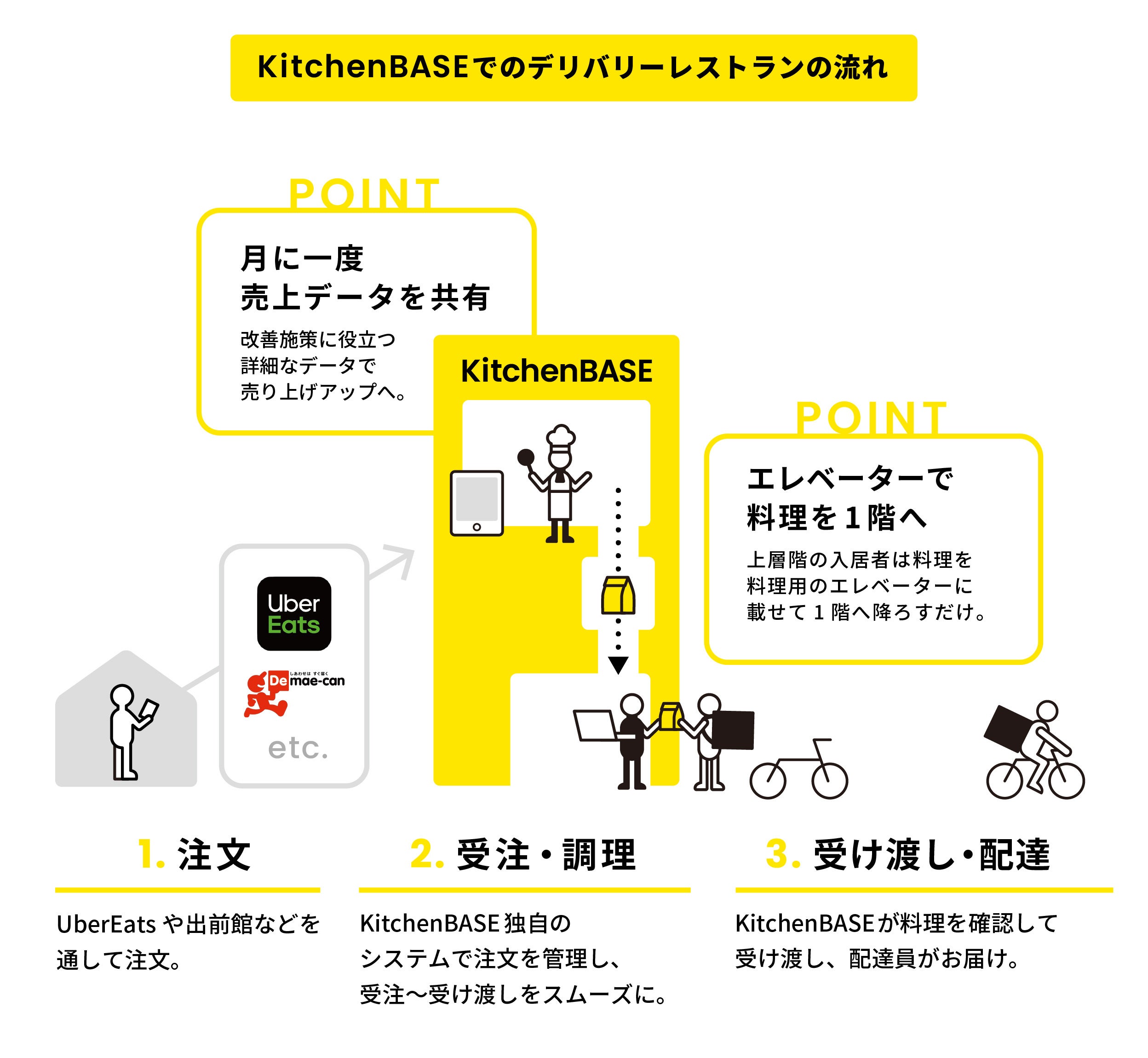 クラウドキッチンとは、オンラインで注文を受けるデリバリー専用のキッチンです。KitchenBASEでは1つの空間を区画で分けて複数の店舗でキッチンをシェアするため、クラウドキッチンと呼んでいます。