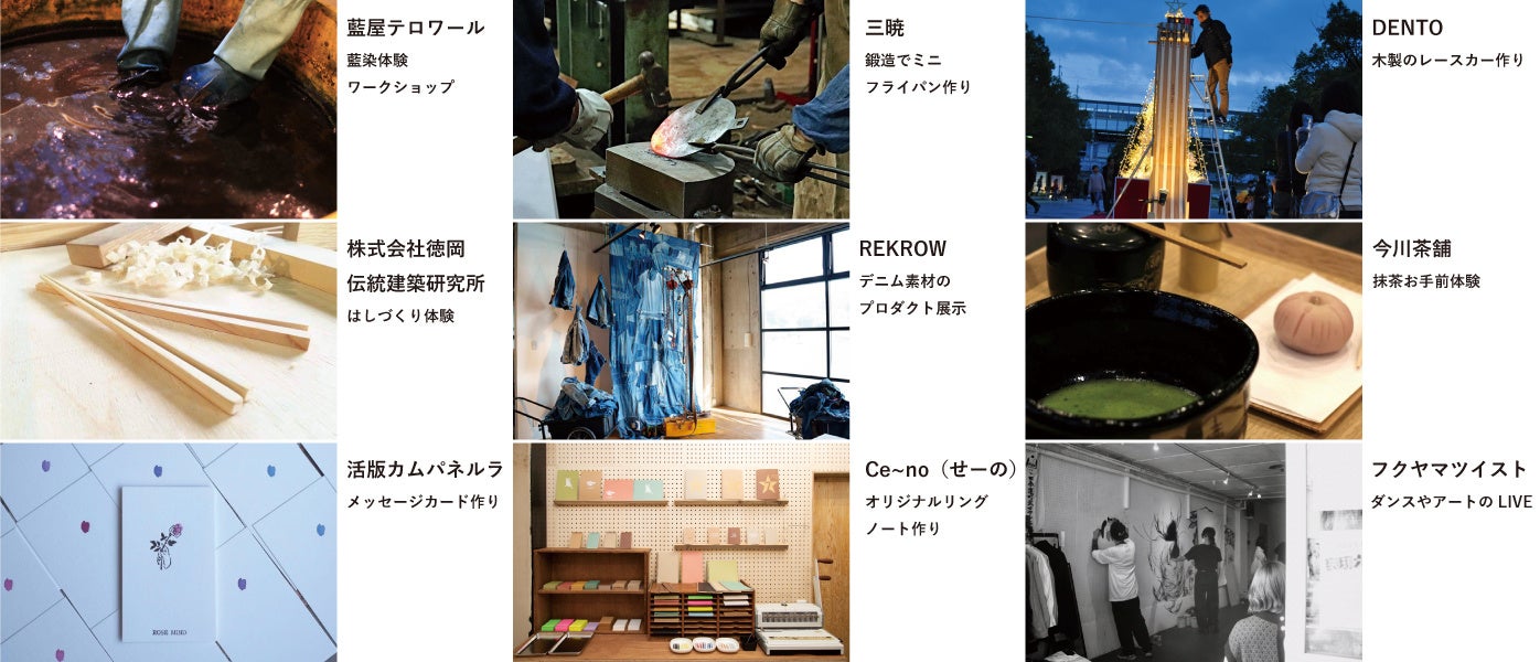 出店者一覧:藍屋テロワール、株式会社三暁、DENTO、株式会社徳岡伝統建築研究所、活版カムパネルラ、Ce~no、今川茶舗、福山ツイスト