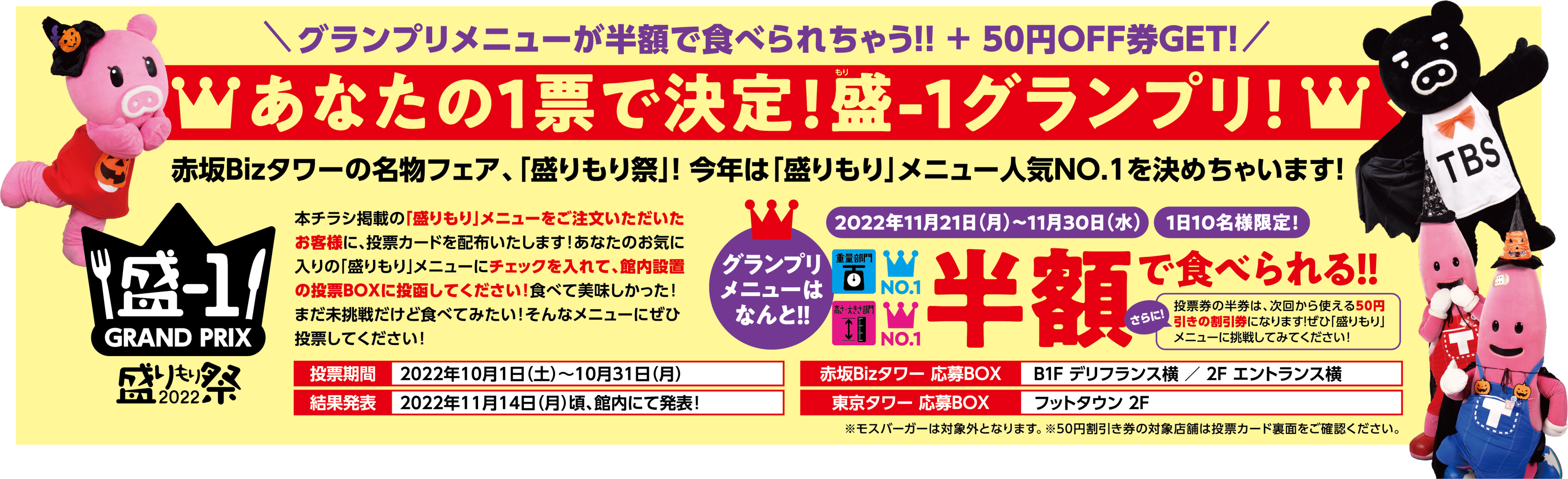 赤坂BizタワーSHOPS & DINING、東京タワー フットタウンで展開する「盛りもり」メニューをご注文いただいたお客様に、投票カードを配布し、お気に入りの「盛りもり」メニューにチェックを入れて、館内設置の投票BOXに投函していただきます。投票数が最も多かったメニュー(重量部門&高さ・大きさ部門各々1メニュー)がグランプリとなり、期間中は1日10名様限定で、通常価格の半額でお召し上がりいただけます。また、投票カードには50円割引券が添付されているので、次回以降お得にご利用いただけます。