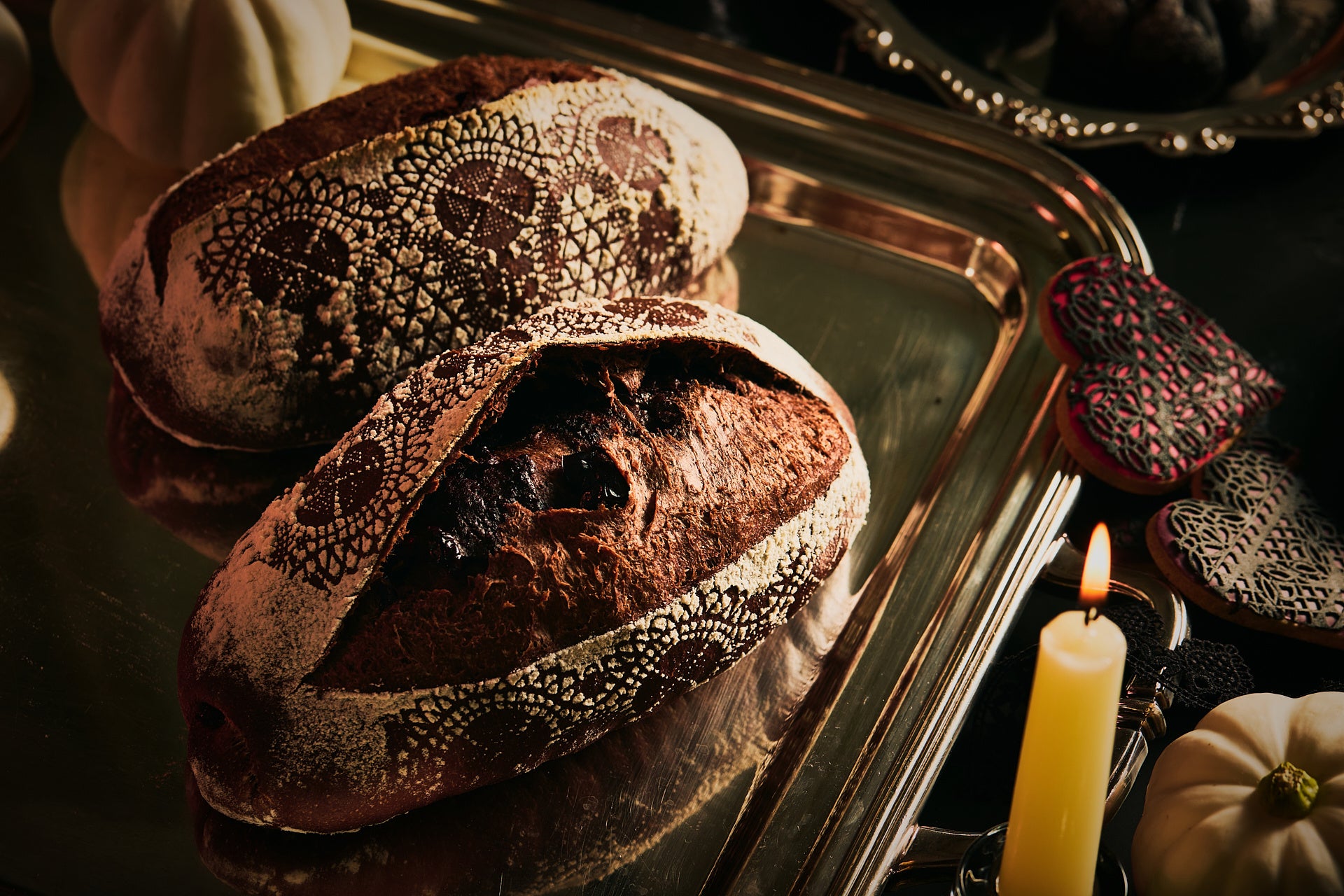 上品なレース模様が洗練されたハロウィンを演出する、見た目にも美しいカンパーニュ。自家製天然酵母を使ったカンパーニュ生地に、フランス・バローナ社のカカオ、カカオ70%のチョコレート(グアナラ)、ドライクランベリーを練り込みました。