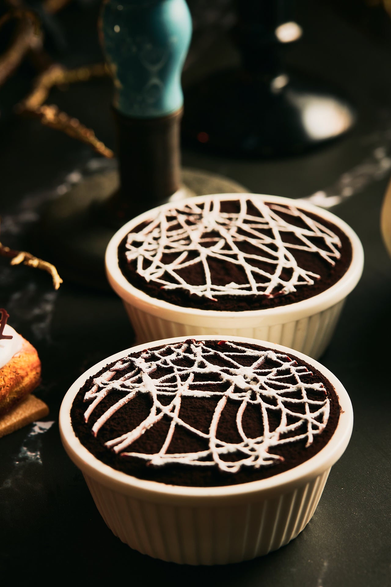 エスプレッソシロップに浸したビスキュイと、濃厚なマスカルポーネチーズのクリームのティラミスを、蜘蛛の巣のチョコレートで飾り付けました。