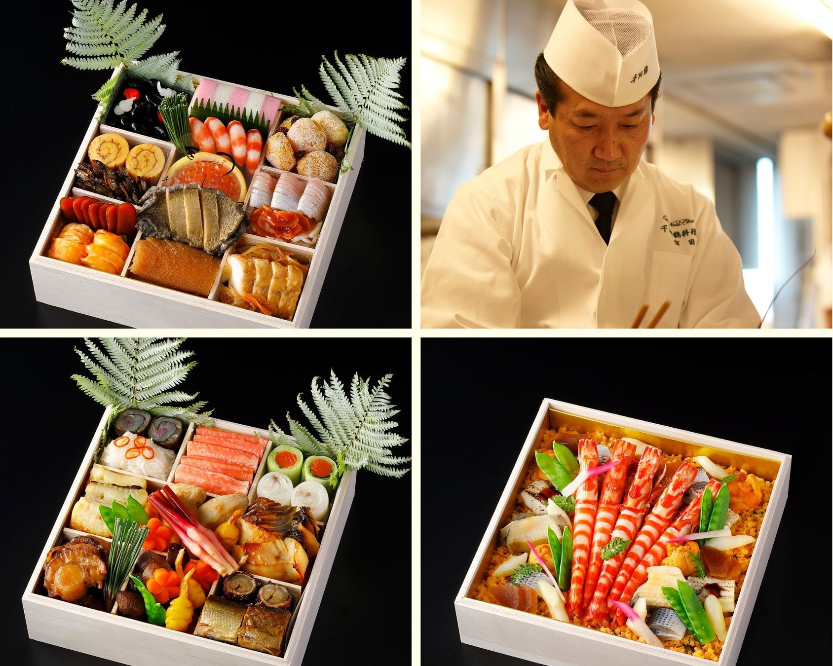 2021年秋の「黄綬褒章」を受章した日本料理料理長 宮田勇が手掛ける和風おせちは、田作り、黒豆、数の子などおせち料理の伝統的な具材に加え、ふっくら柔らかく蒸しあげた鮑や、雲丹味噌で和えた伊勢海老などホテルならではの逸品をたっぷりと敷き詰めました。そして、縁起の良い末広がりに盛り付けた車海老、蒸し雲丹や、煮鮑などを贅沢に使用し、祝い事にはかかせないちらし寿司をおせち仕様にした「新江戸前ちらし寿司」をご用意いたしました。