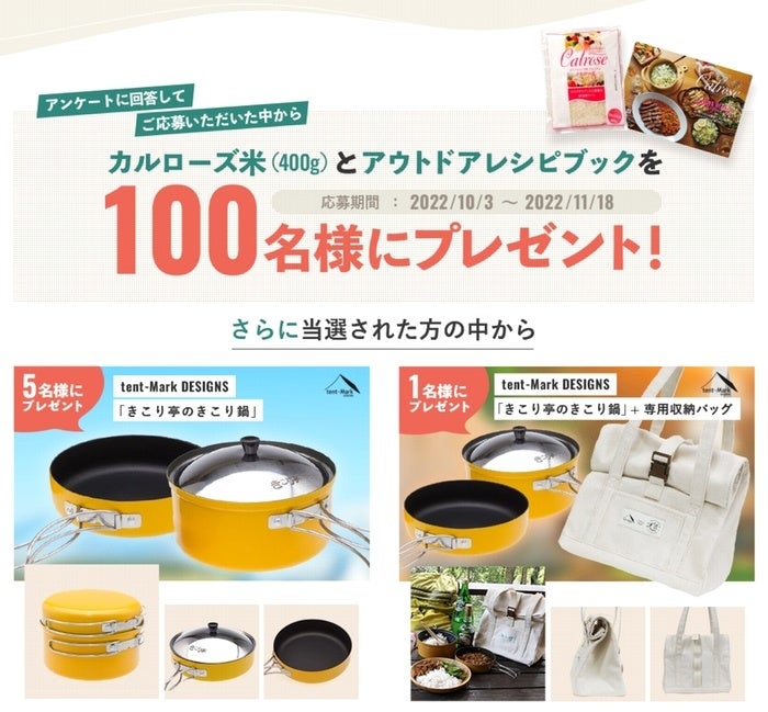 キャンペーン特設ページから簡単なアンケートにお答えいただいた方を対象に、抽選で合計100名様に「カルローズ米」と「アウトドアレシピブック」をセットにしてプレゼントいたします。さらに、当選者100名様のうち6名様には、tent-Mark DESIGNS(テンマクデザイン)のアウトドア商品が当たります。