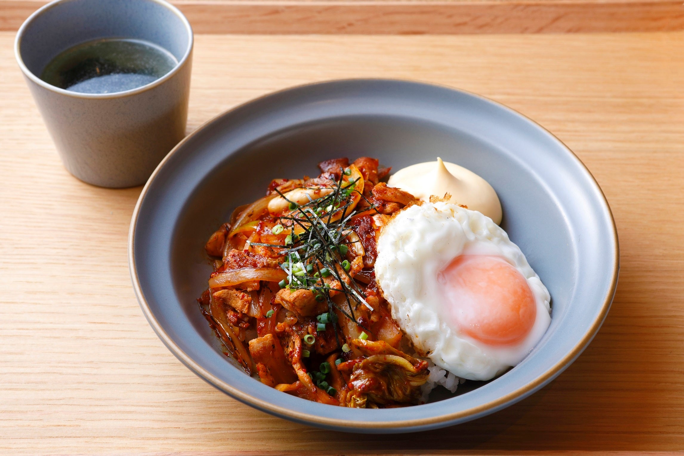 お好み焼き・焼きそば「タンポポ」鉄板焼き屋の豚キムチ丼 半熟たまごのせ(スープ付) 1,200円