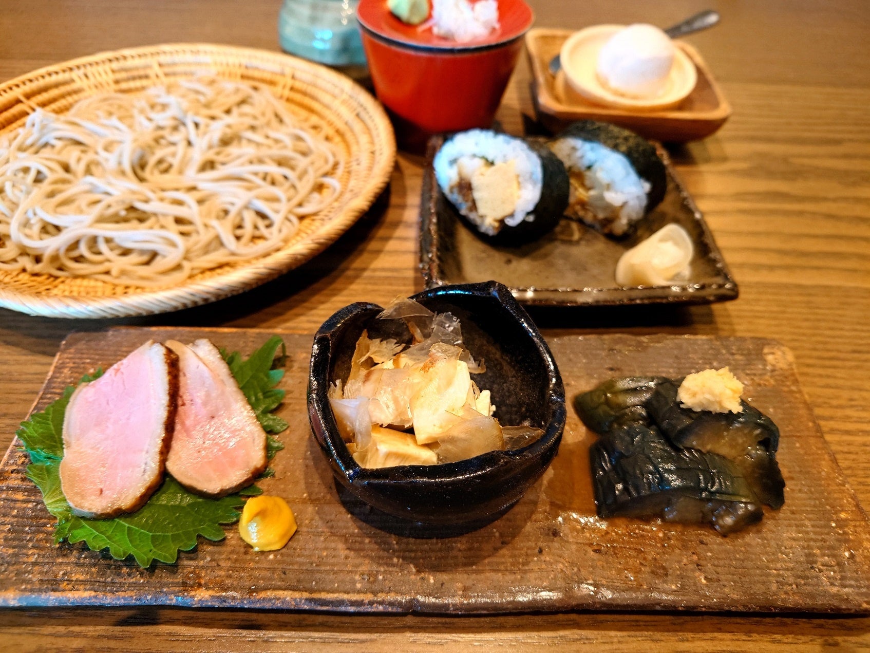 蕎麦前3種(鴨ロース、ナスの田舎煮、クリームチーズの味噌漬)、太巻、せいろそば又はかけそば、そば茶アイスのお得なセット。