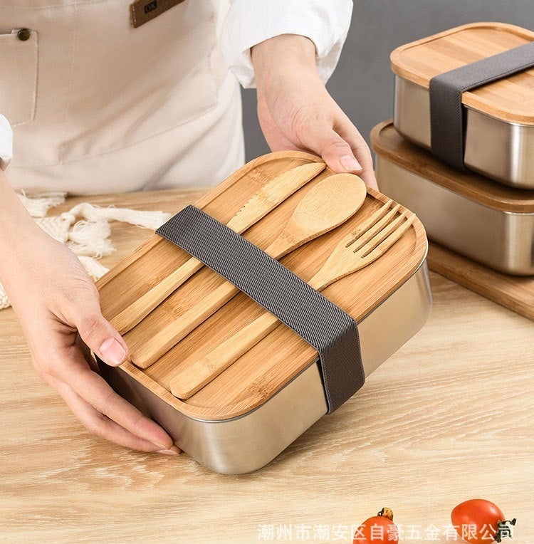 ステンレス製のシンプルな形状に竹製の蓋とナイフ、フォーク、スプーンが付いたおしゃれな弁当箱。