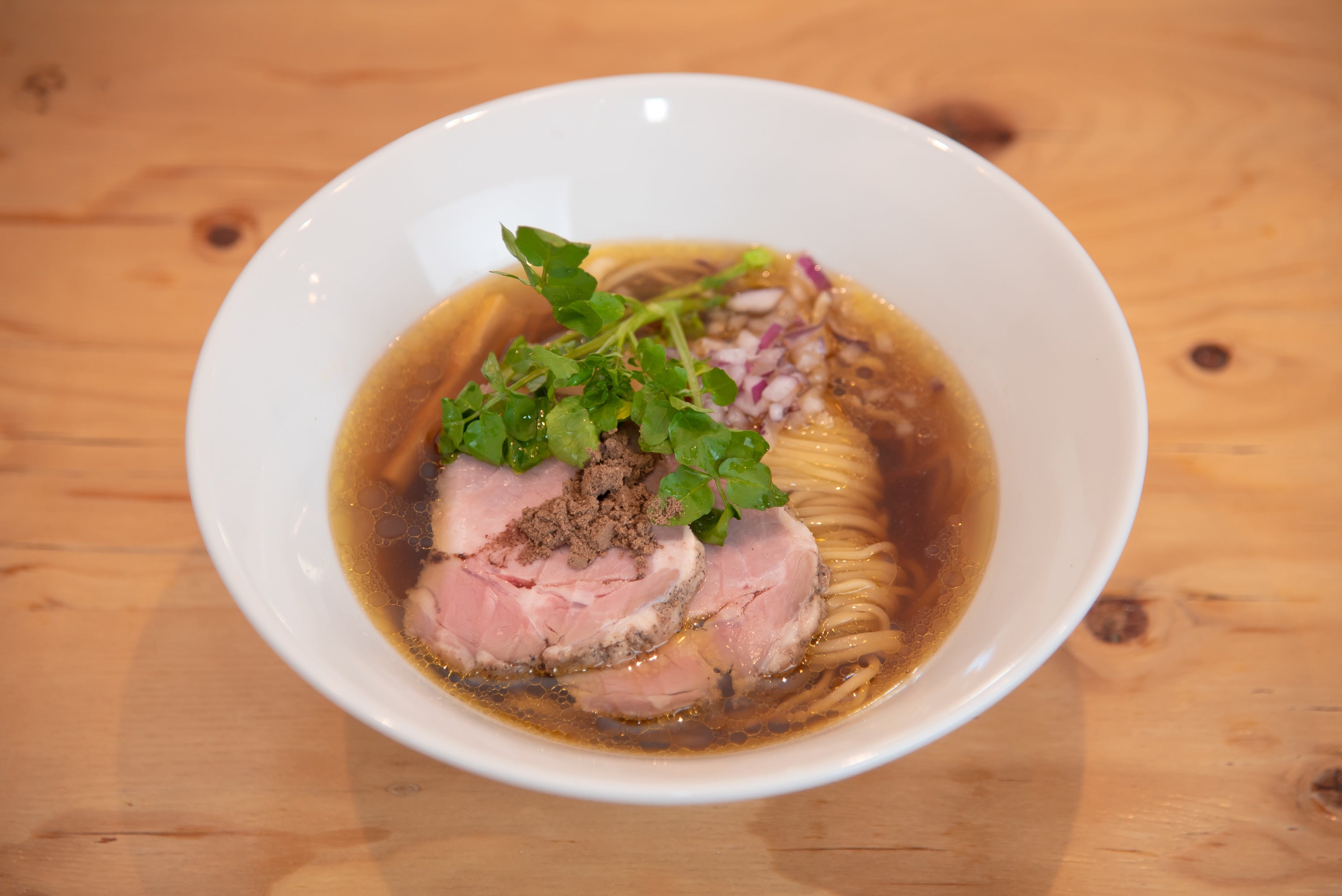 鶏清湯スープと宍道湖で捕れるしじみを丁寧に引きWスープで合わせ、そこにイタリア産の黒トリュフパウダーを。食べ進めるとトリュフ、鶏、醤油などの様々な香りが、後半スープの温度が落ちてきた時からしじみの香りがより前に出てきます。