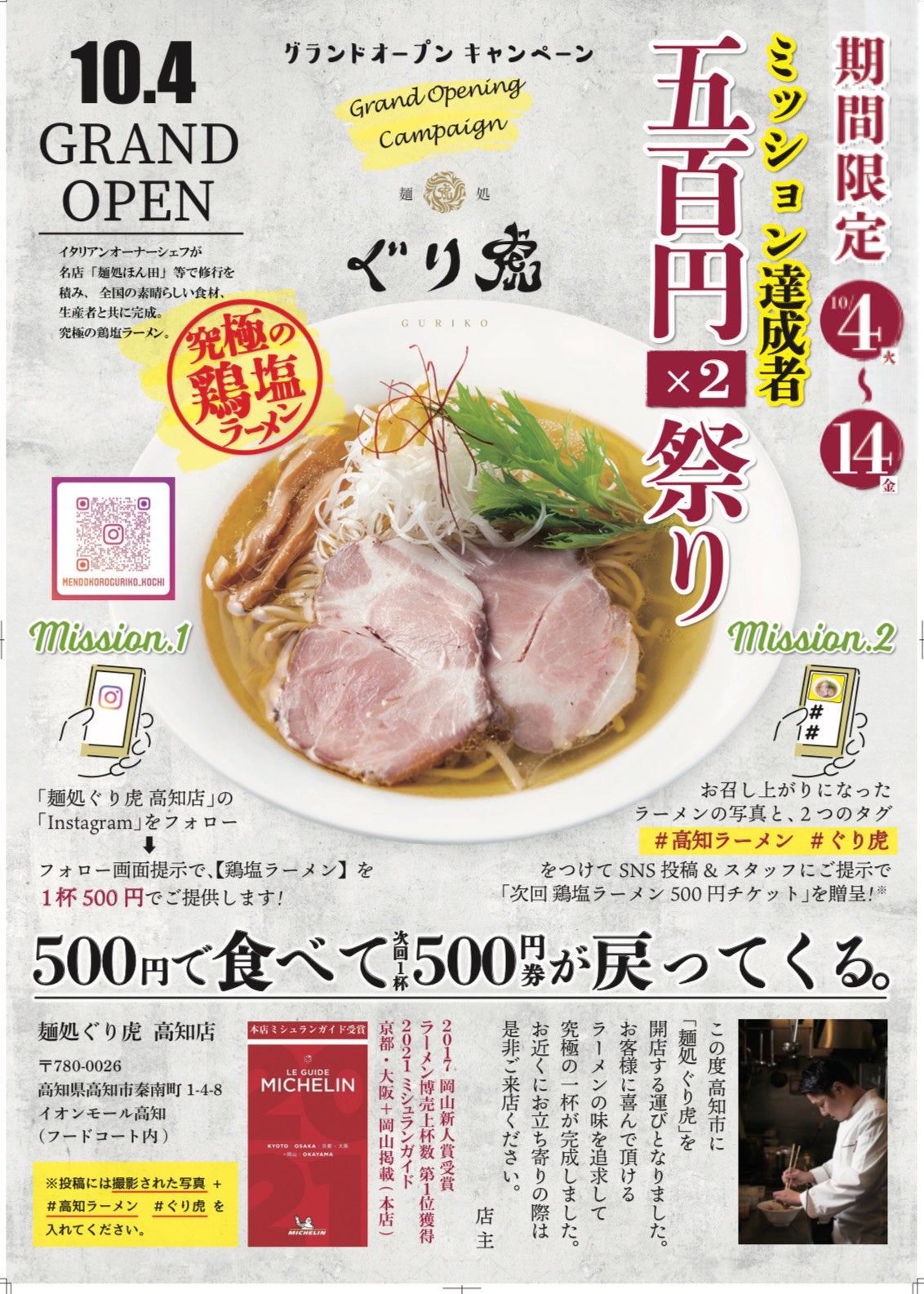 株式会社guriko(本社:岡山県岡山市、代表取締役:礒貝 翔)は、「麺処ぐり虎(guriko)」を四国にて初出店!