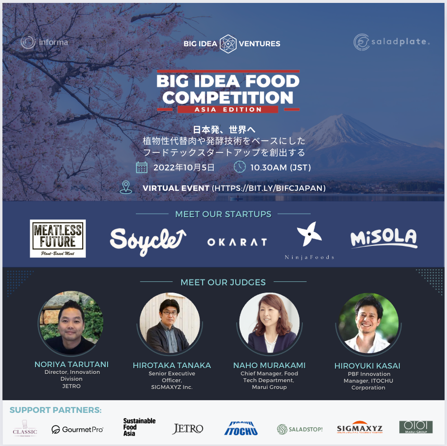 10月5日に開催されるBig Idea Ventures社のBig Idea Food Competition (BIFC) Japanを、Sustainable Food Asia社、GourmetPro社と共同で開催致します。