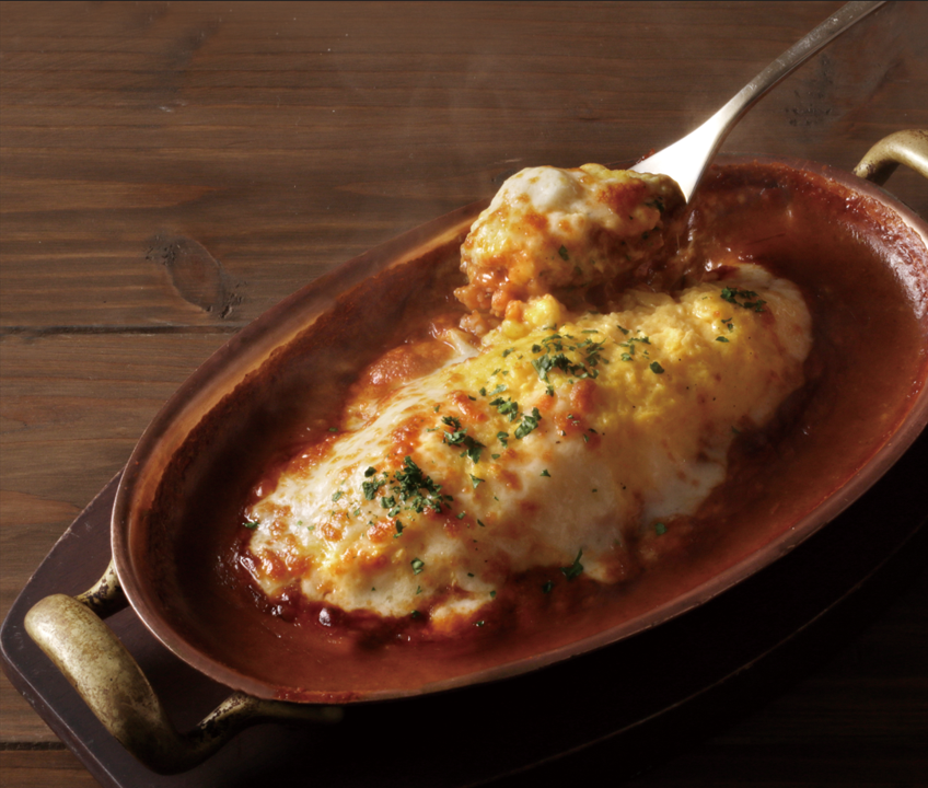 ふわっとろっのオムライスを、なんと!ドリア仕立てにしたひと皿。バターが香るふわふわのオムレツ部分は、コクのあるチキンライスと相性抜群。濃厚なデミグラスソースを絡めてお召し上がりください。