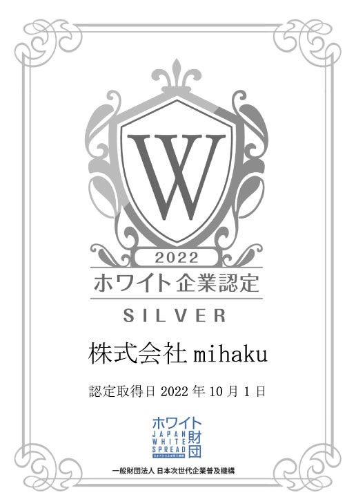 日本料理店「京都 瓢喜*(ひょうき)」「香水亭(かすいてい)」「京都 瓢斗(ひょうと)」を国内・中国北京に展開する株式会社mihaku(東京都中央区銀座7-16-14 8階 代表取締役社長 中嶋一生)は、2022年10月1日、一般財団法人日本次世代企業普及機構(通称:ホワイト財団)が運営する「ホワイト企業認定 シルバー」に認定されましたことをお知らせいたします。*正しくは、口へんに喜