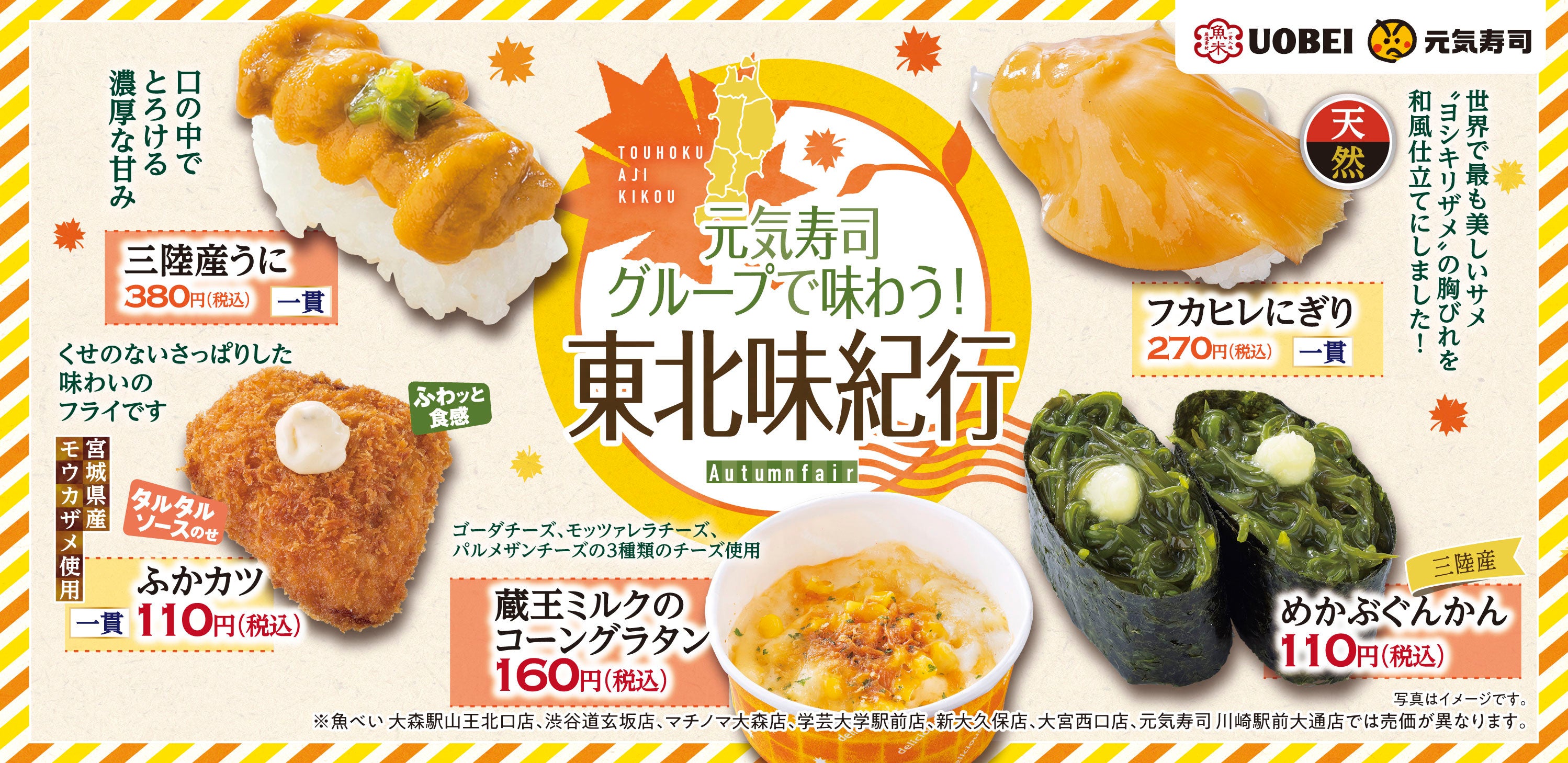 寿司レストランチェーンを展開する元気寿司株式会社(本社:栃木県宇都宮市 代表取締役会長兼社長 藤尾 益雄)は、全国の元気寿司・魚べいにて2022年10月4日(火)より期間限定で、『元気寿司グループで味わう!東北味紀行』と『秋の厳選メニュー』フェアを同時販売いたします。東北グルメや、「食欲の秋」にぴったりな豪華食材を同時に楽しめるのは今だけ!この機会にご堪能ください!