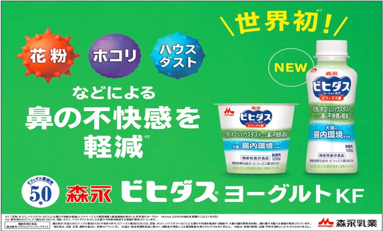 森永乳業は50年以上にわたって取り組んできた腸内細菌(腸内フローラ)やビフィズス菌研究を通じて、森永乳業独自のビフィズス菌である『ビフィズス菌BB536』が、花粉、ホコリ、ハウスダストなどによる鼻の不快感を軽減する作用を発見しました。2022年1月には、年々増加傾向にある鼻の不快感でお困りの方々を身近な食でサポートしたいという想いから、“世界初”※1花粉、ホコリ、ハウスダストなどによる鼻の不快感を軽減するヨーグルト「ビヒダス ヨーグルトKF」を発売しました。発売以来、季節を問わず年間を通じて安定した売上で推移し、多くの方からご支持いただいています。