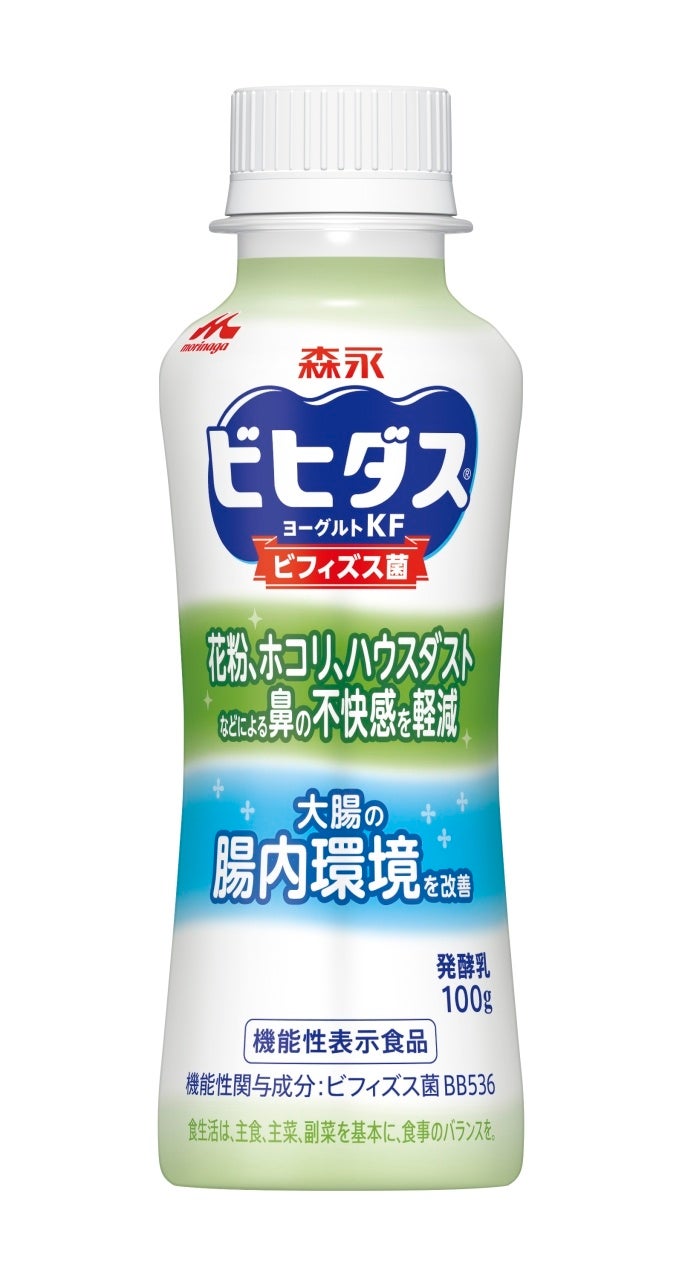 「ビヒダス ヨーグルト KF」シリーズは、どちらも『ビフィズス菌BB536』を関与成分とし、花粉、ホコリ、ハウスダストなどによる鼻の不快感を軽減することを謳った機能性表示食品です。このたび、新発売するドリンクタイプと、2022年1月に発売した食べるタイプの2種類がございますので、お好みに合わせてお召し上がりください。