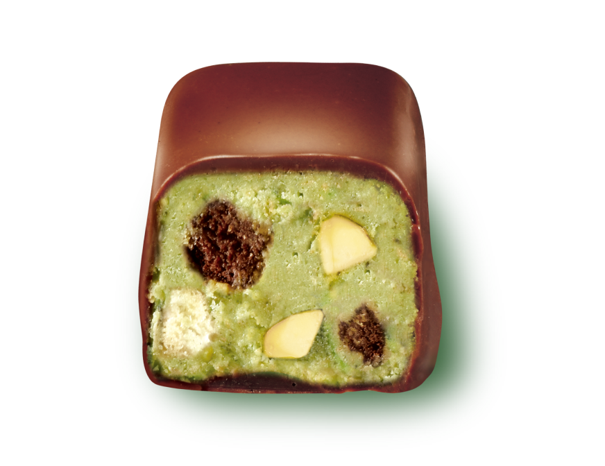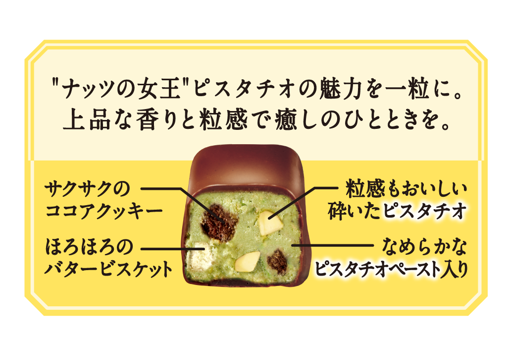 「一粒の満足感」をお楽しみいただくためにココアクッキーやバタービスケットに加え、イタリア産ピスタチオ使用のペーストと、アメリカ産ピスタチオ使用のクラッシュピスタチオの2種類のピスタチオ原料を使用しています。濃厚で上品な香りと味わいとピスタチオ特有の粒感などの食感でピスタチオをしっかりと堪能することができます。