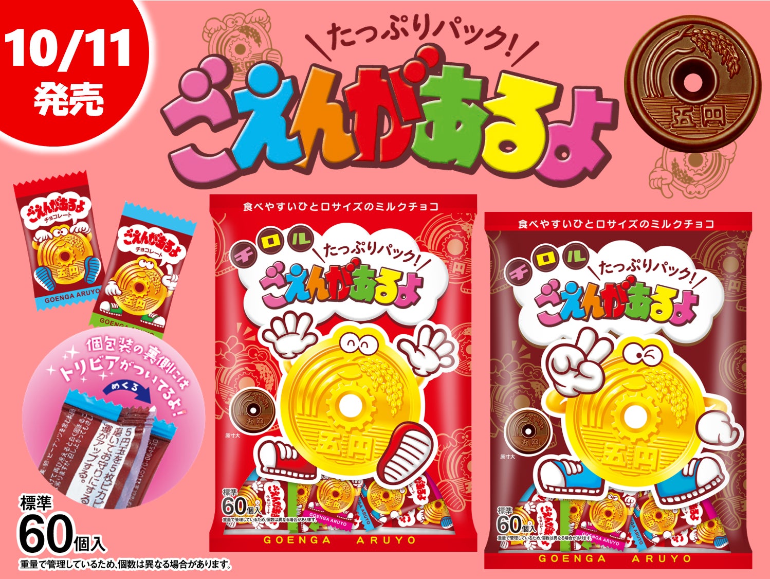 「ごえんがあるよ」は1984年に誕生した、5円玉の形をしたミルクチョコレート。発売当時は単品で販売していましたが、時代とともに、袋商品として売られるようになりました。発売から30年以上が経った今でも多くの人に愛される昔なつかしい商品です。