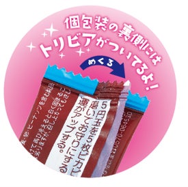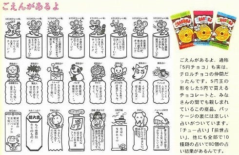 1984年に“10円より安いチョコを”と誕生した、5円玉ひとつで買えるチョコレート。時代とともに駄菓子屋が減少したことにより5円での単品売りが難しくなったため、袋商品として売られるようになりました。(※現在、1枚5円での販売はしておりません。)発売初期は、裏面に「チュー占い」「前世占い」など計80パターンの占い結果が書かれていました♪