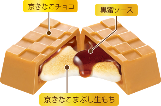 香り高いきなこチョコと、京きなこをまぶした生もちの柔らか食感がマッチ。黒蜜ソースがアクセントになり、まるで和菓子のようなチョコに仕上げました。
