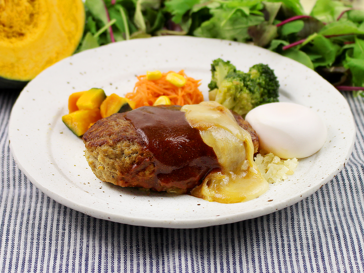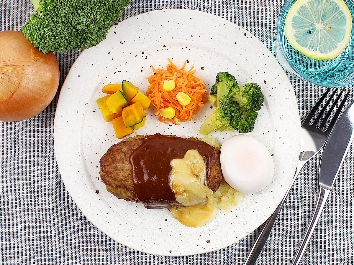 ジューシーなグリルハンバーグに濃厚な特製デミグラスソースをかけた子供も大人も楽しめるプレートです。チーズと半熟卵をトッピングしていますので、絡めてお召し上がり下さい。