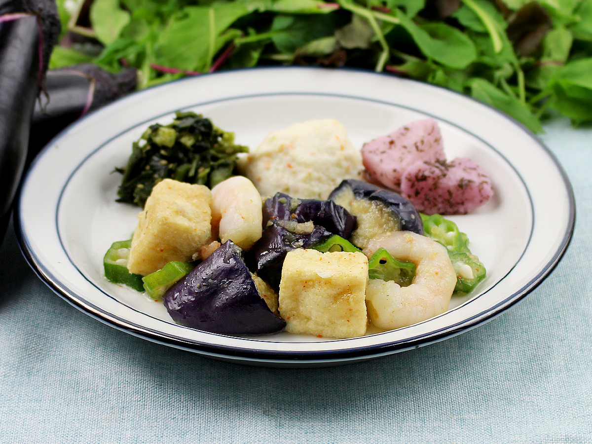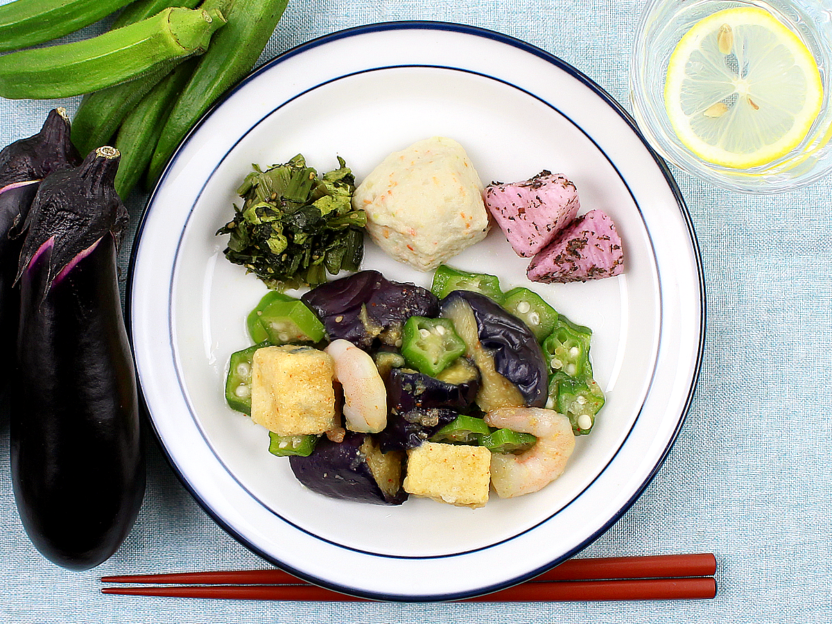 かつお出汁と生姜を効かせたおだしであっさりと食べられる、茄子と絹揚げの揚げ浸しです。旨味を凝縮したおだしには、おろし生姜、一味唐辛子、風味豊かなごまを合わせたお味に仕上げております。刻んだオクラ、プリッとした海老と共にお召し上がりください。