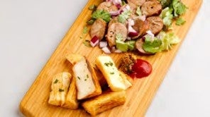 ブラジルの定番リングイッサはジューシーで味も香りもしっかりとしたソーセージ。これにさらにマンジョッカも加えたワンプレートです。