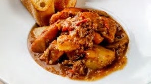 キャッサバと牛肉を玉ネギ、トマト、パプリカやパクチー、香辛料で煮込んだブラジルの家庭料理をアレンジしました。バゲットと一緒に、ビールにも合います。