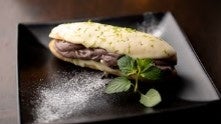 タピオカのチーズパン、ポンデケージョにアサイーとマスカルポーネクリームをサンドして爽やかなライムの香りを加えたエクレア仕立にしました。