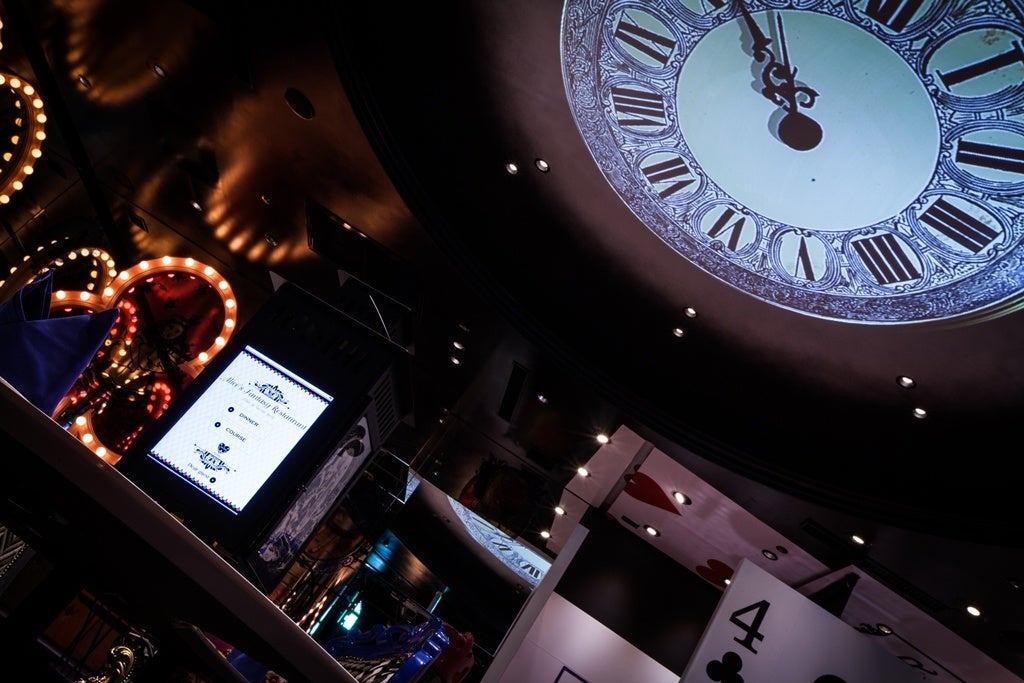 エントランスに立ちはだかるトランプ兵の脇をスルリと抜けて一歩中に足を踏み入れると、天井に大きな懐中時計が浮かび上がる空間が出現!