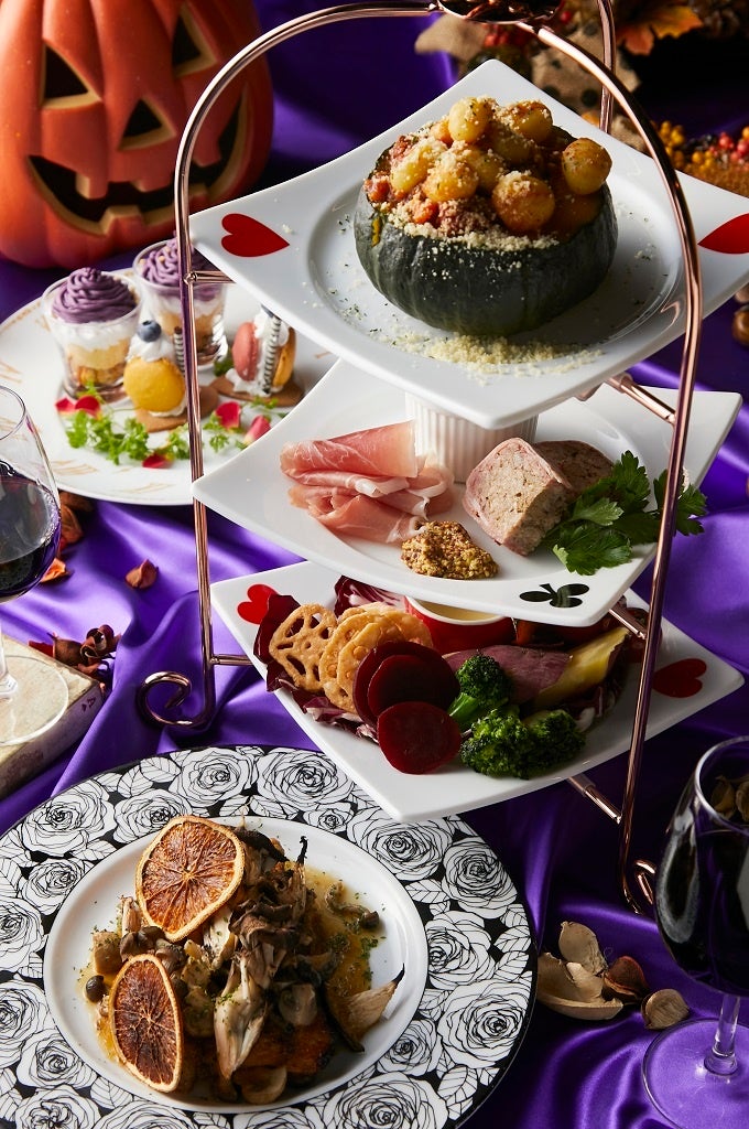 「幻想のハロウィンコース」ご提供期間内にご来国が難しいゲストにも、ハロウィンパーティの 雰囲気を楽しんでいただきたいと、不思議の国の住人がご用意したのが、近年人気が急上昇している「ハイティー」スタイルのセットメニュー。