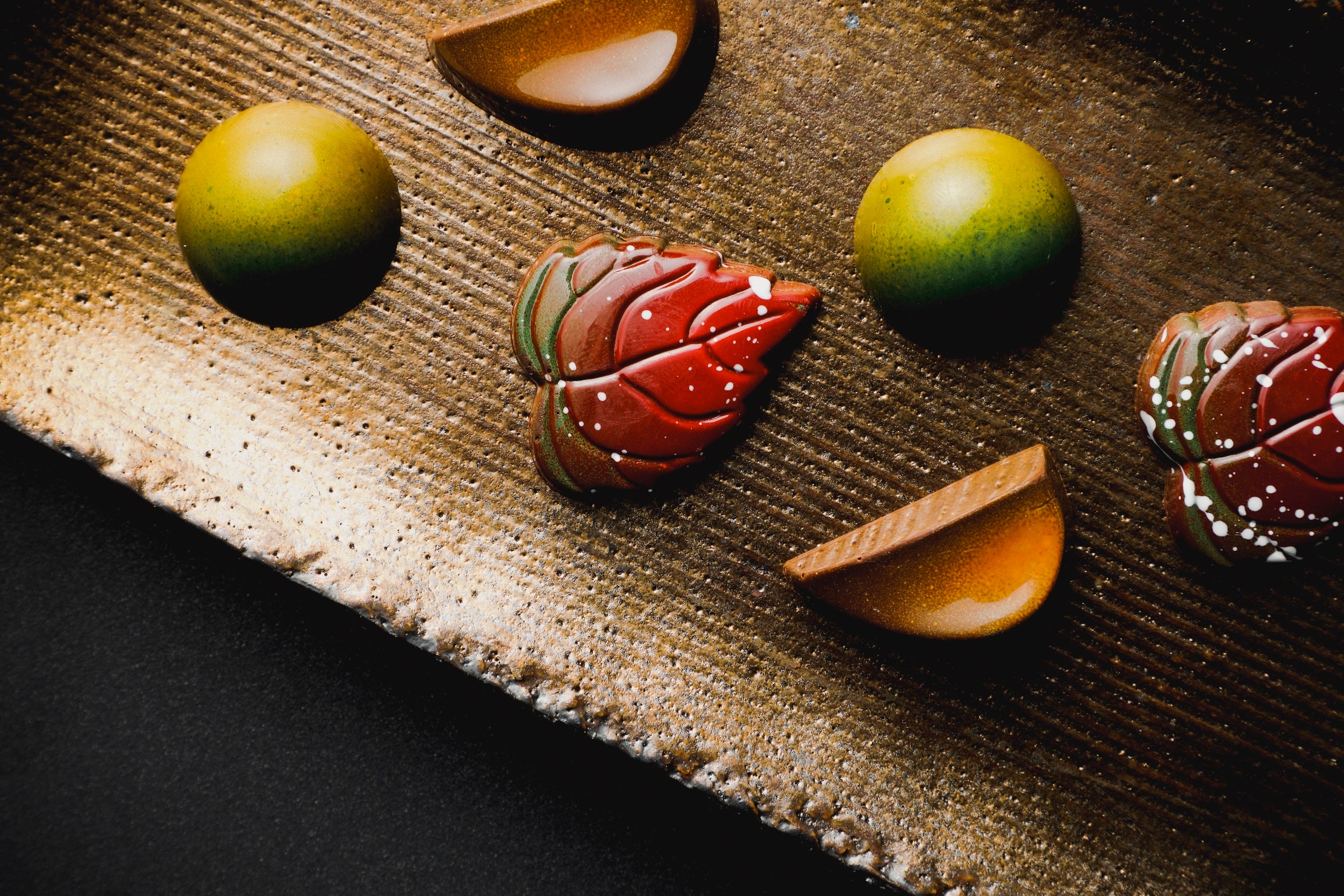 「山椒ショコラ」 葉っぱを模ったチョコレートには、アマン京都の山で採った山椒を使用してます。山でシェフが摘んだ山椒の果実は、煎じて独特の風味を最大限に引き出した後、砕いてパウダー状にし、ガナッシュに忍ばせました。山椒のスパイスと芳醇なカカオを堪能できる大人な一品です。