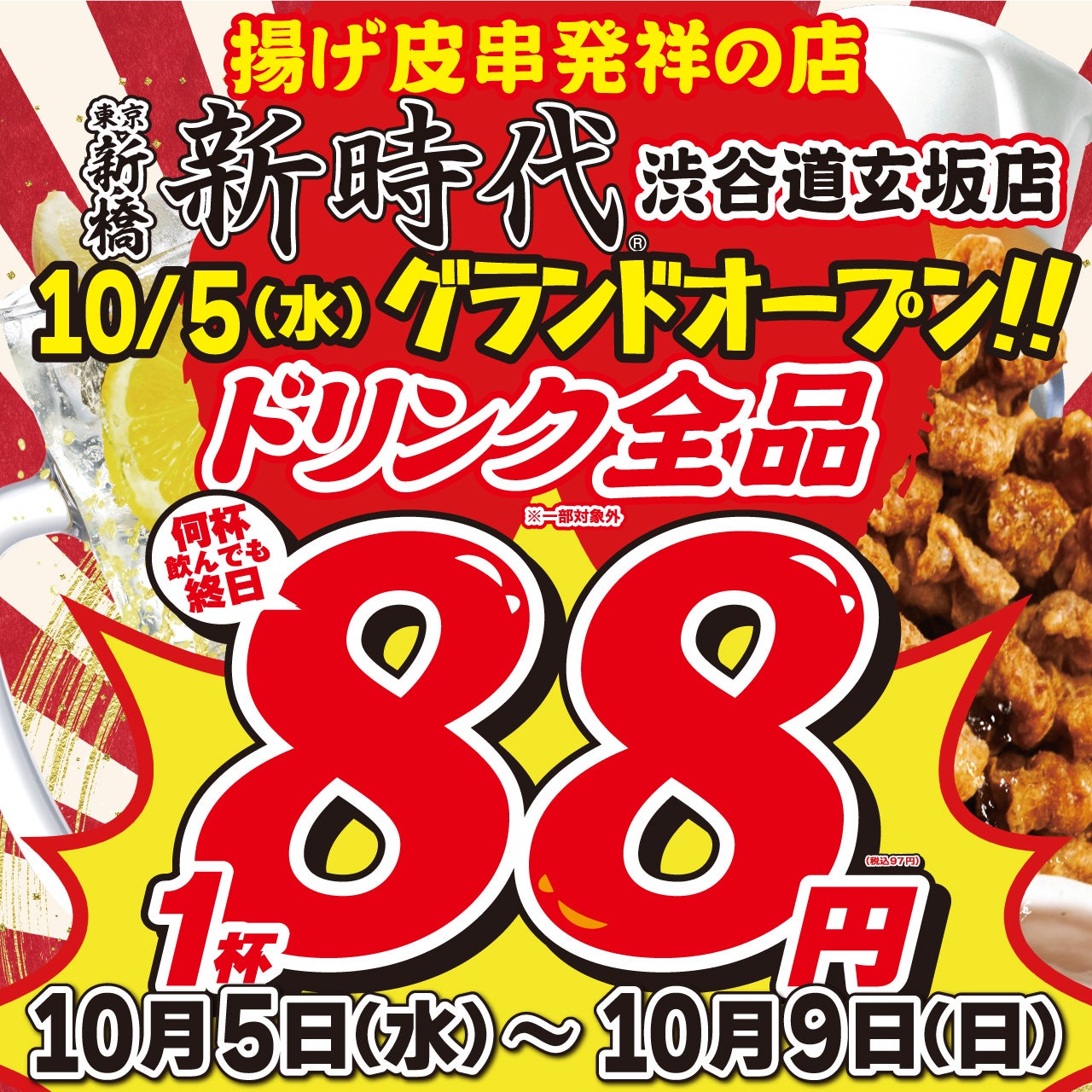 『新時代 渋谷道玄坂店』では、オープンを記念して、期間限定でドリンク全品を88円で提供いたします。