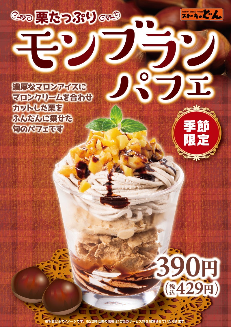 『ステーキのどん』では、2022年10月7日(金)から秋季限定のデザートとして、栗たっぷりの「モンブランパフェ」を販売いたします。