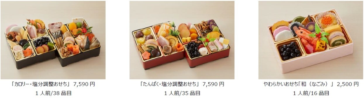 おせちは保存をするために味が濃く、塩分が高いものが一般的ですが、エネルギーと塩分を調整した「カロリー・塩分調整おせち」は極力塩分の低い食材を使用し、1段あたりの食塩相当量は4.0g未満となっています。また、エネルギーや塩分だけでなく、たんぱく質やカリウム、リンなども調整した「たんぱく・塩分調整おせち」は食塩相当量を1段あたり3.0g未満に抑え、たんぱく質を抑えたときにエネルギーも低くなりすぎないようにいも類やデザート系を多く使用しています。噛む力が弱くなった方のためにもテリーヌや、ムースでかたどった海老などやわらかい食材を集めた「和」もご用意しており、栄養価の調整が必要な方でもおせち料理で食べる楽しみやお正月気分を味わえるように作っています。