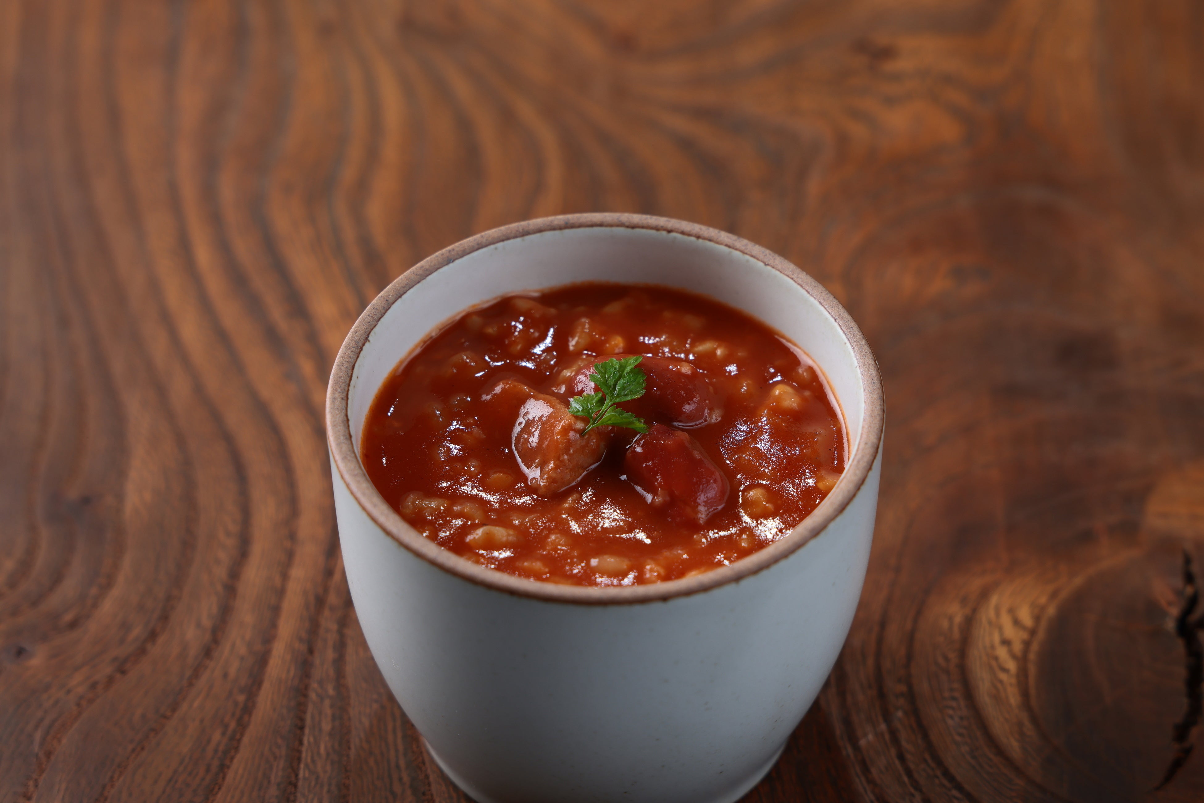 トマトピューレで三元豚と赤いんげんまめを煮込んだ旨味と酸味とコクのあるリゾット