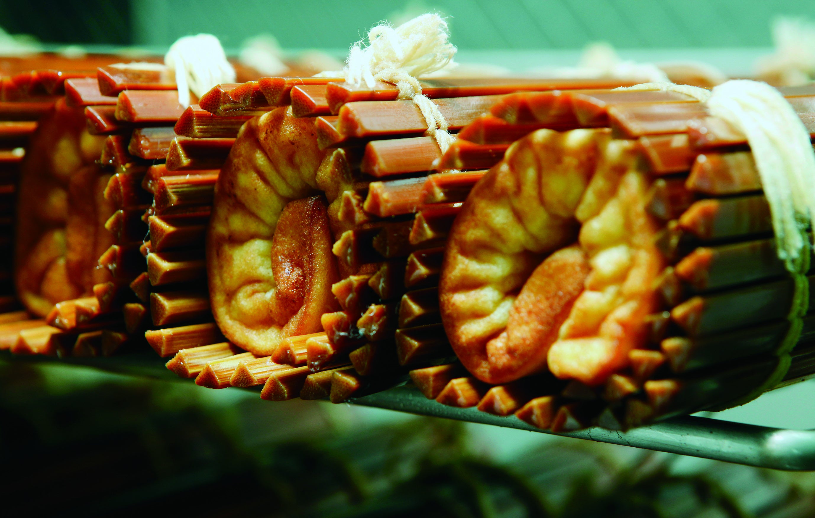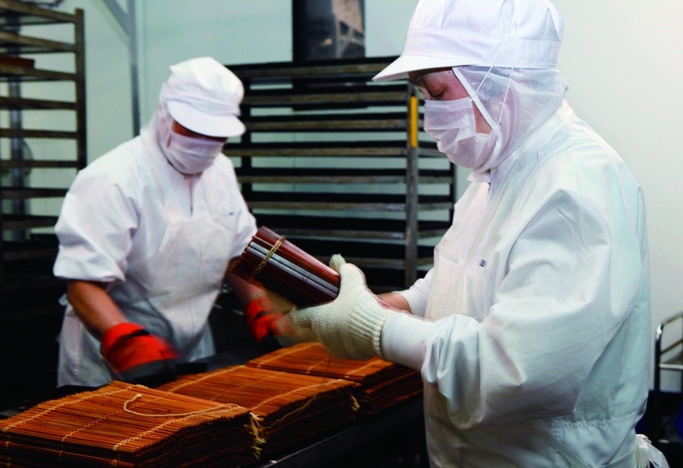 伊達巻の素材を安定させてすり身を混ぜる「すり」の作業、焼きの温度調整など、一人の職人の技術と勘で細かな調整を繰り返しています。 仕上げの「巻き」は1本1本、機械に頼らずやさしく手で巻きます。