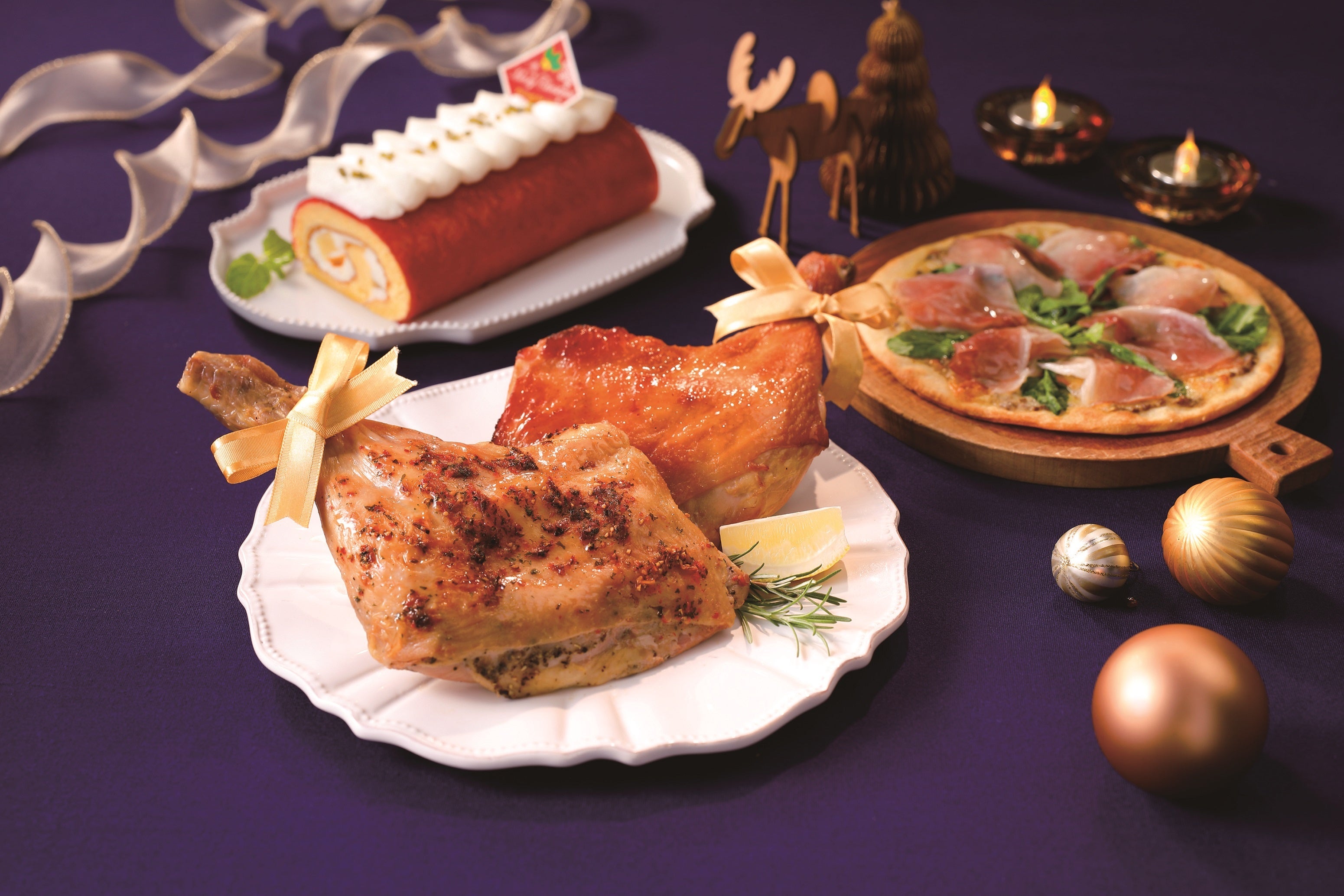 左奥:クリスマスロールケーキ、手前左:ローストレッグ(ハーブ)、右:骨付きモモ照り焼き、右奥(トッピング):無塩せき生ハム