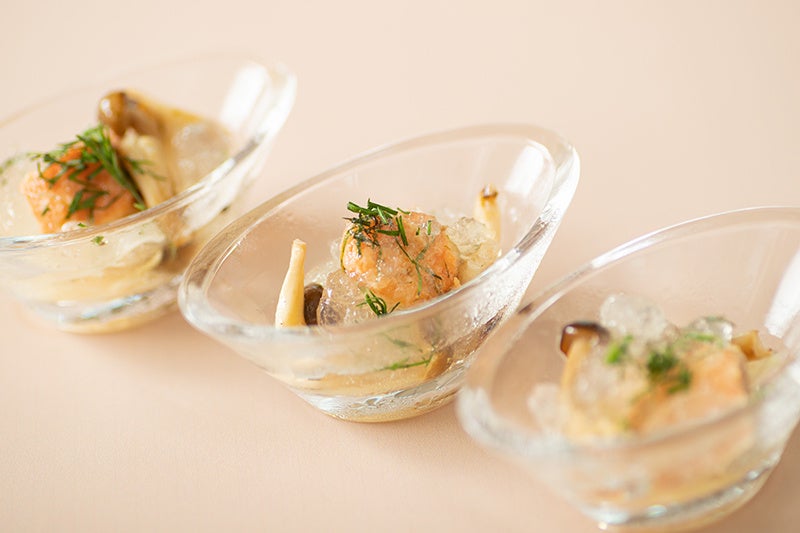 爽やかな香りの琉球よもぎ(ハママーチ)をジュレ仕立てにして、サーモンと合わせたタパス(前菜)料理です。キリっと冷えた白ワインによく合います。