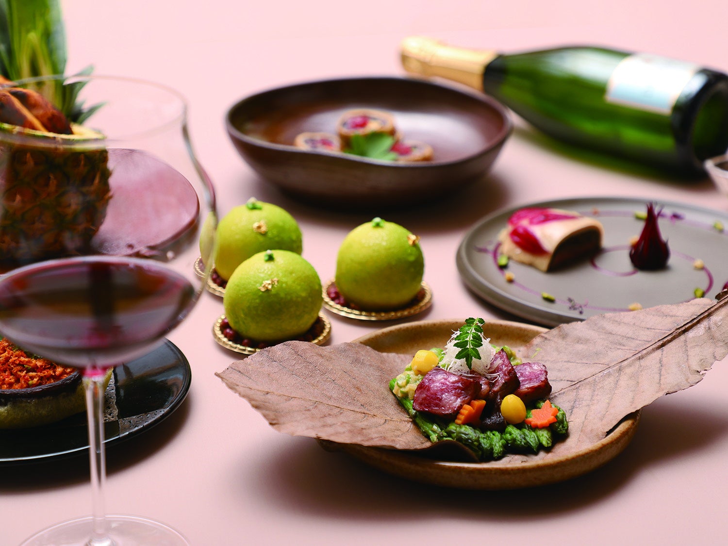 知花さんの琉球よもぎのジュレ&サーモンのエスカベッシュ、当真さんの黄金芋とスペアリブ、金城さんの紫黒米でブラックいなりetc.