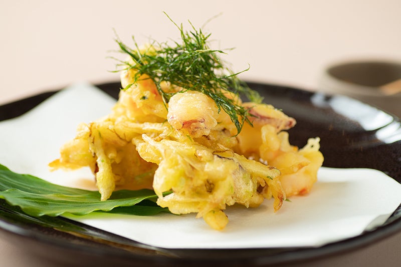 香りの強い葉、食感が良い茎、辛味が爽やかな根を使って、魚介とあわせてかき揚げを作りました。サクサクの味わいをお楽しみください。