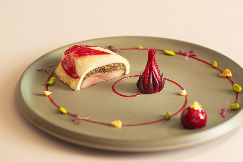 ハイビスカスティーとして使われることが多いローゼル。ローゼルの酸味と甘みが、クラシカルな調理法で仕上げた秋の味覚のジビエ(鳩)にぴったりです。ローゼルの鮮やかな赤が映える美しい一品。