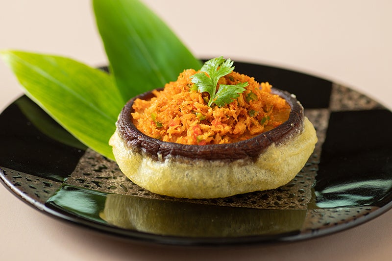 衣をつけて揚げた肉厚の椎茸に、中華のレッドスパイスをたっぷりからめてご賞味ください。